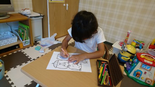 お兄ちゃんがドラえもんのぬり絵をしていると、弟くんもポケモンのぬり絵を始めました。