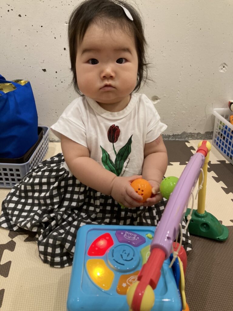 お母様と離れたすぐは、玩具を握って このままご機嫌にあそび始めてくれるかな😆と記念にパチリのお写真です🌷