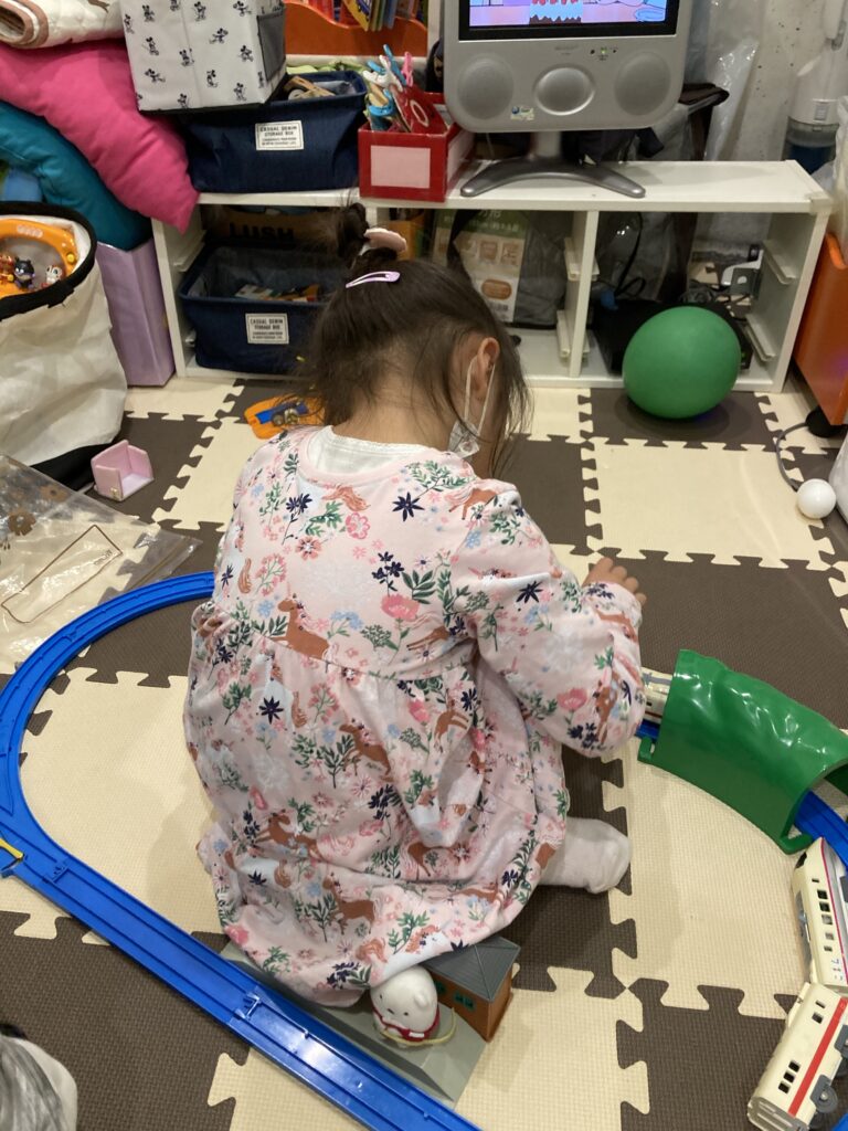 お兄ちゃんの作ったレールが気になって真ん中へ座っております🤗