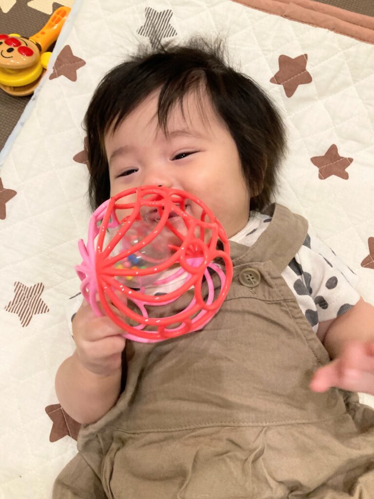 お昼寝もして、スッキリしたあとは、オーボールで遊んでまたまたにっこり🎵