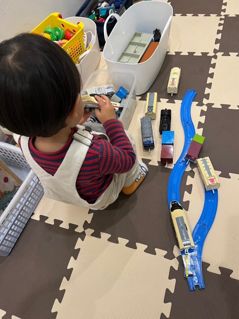 新幹線にたくさん興味をもっていて、お絵描きもしました。力強く描く丸や線の絵がとても素敵でしたよ。