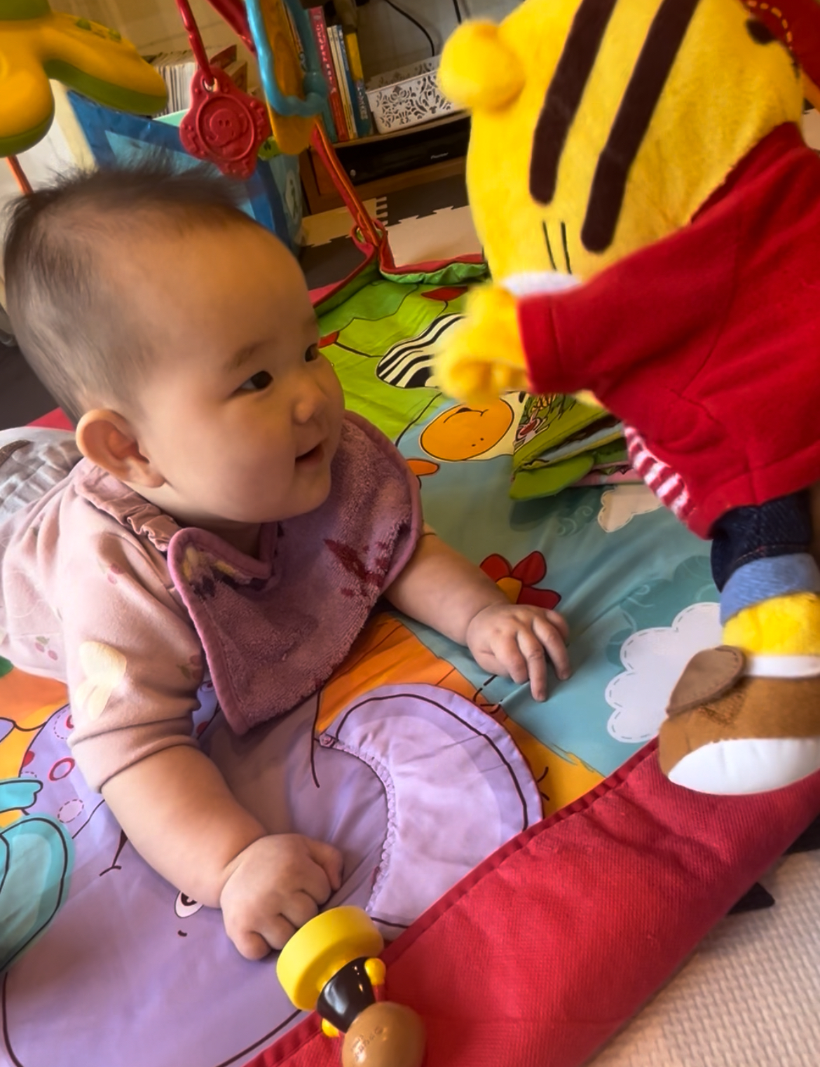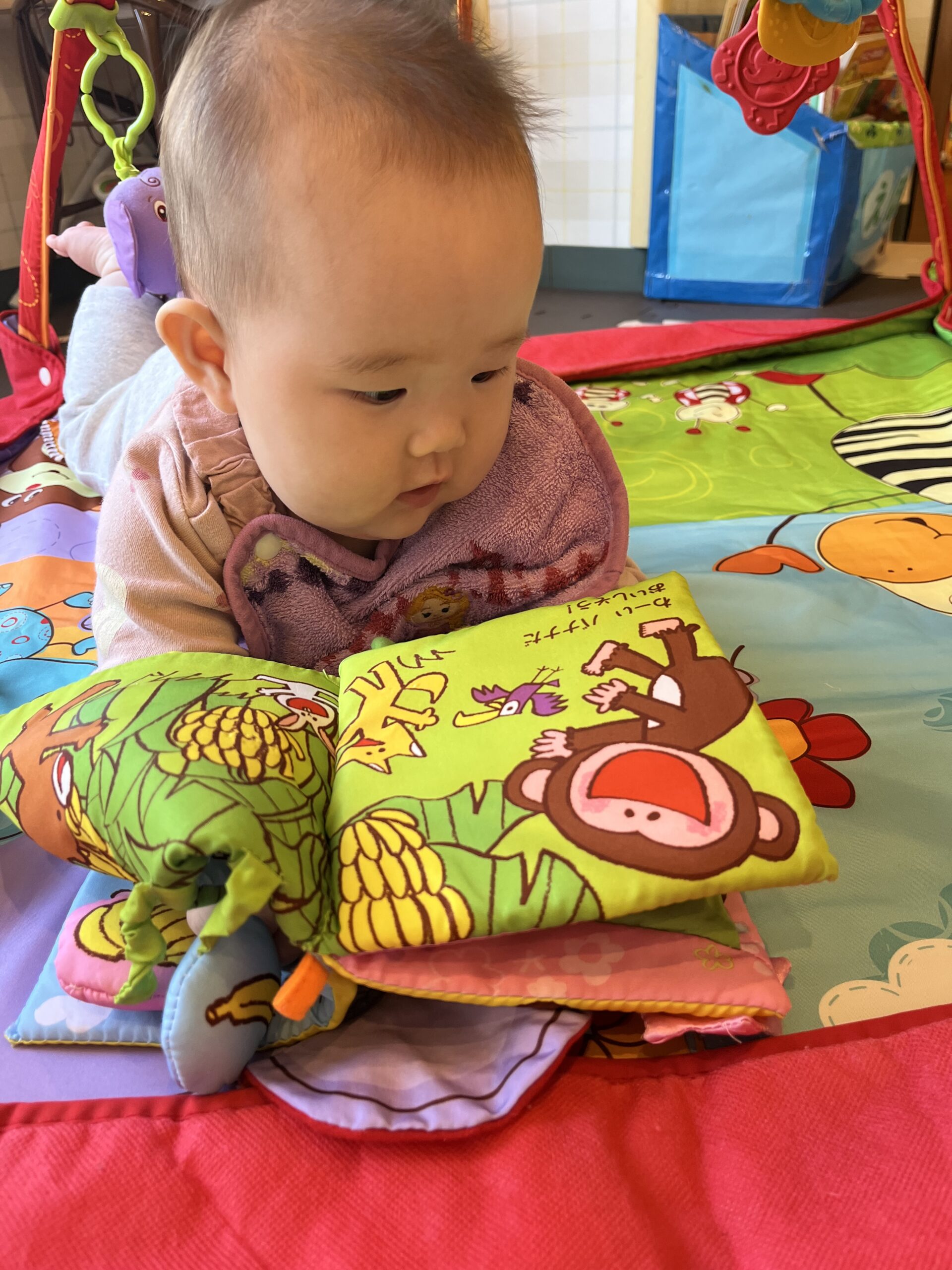 お人形の動きや天井のライトをじーと見たりガラガラの音のする方にお顔を向けてくれたり、色々な物に興味いっぱいでした✨