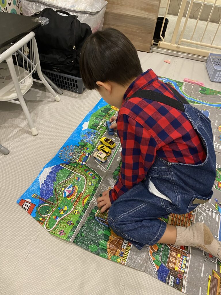 大好きなトミカを綺麗に駐車することに夢中の男の子✨保育士とトミカを走らせ合いっこして楽しく遊びました☺️