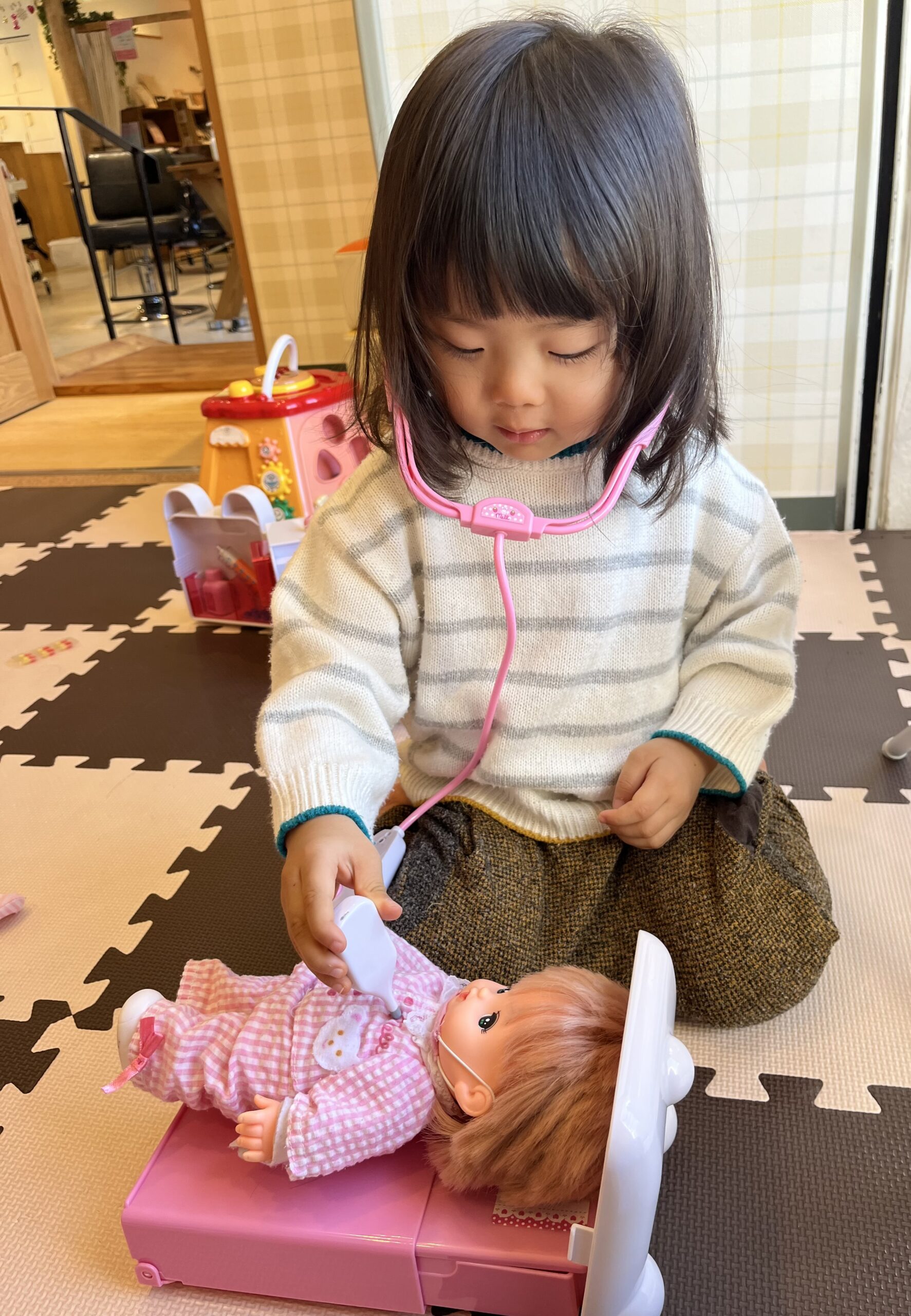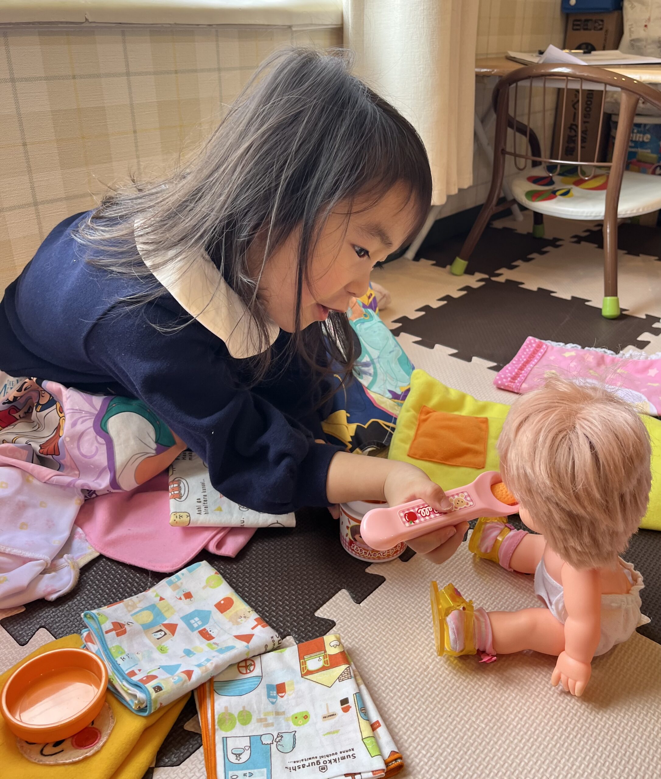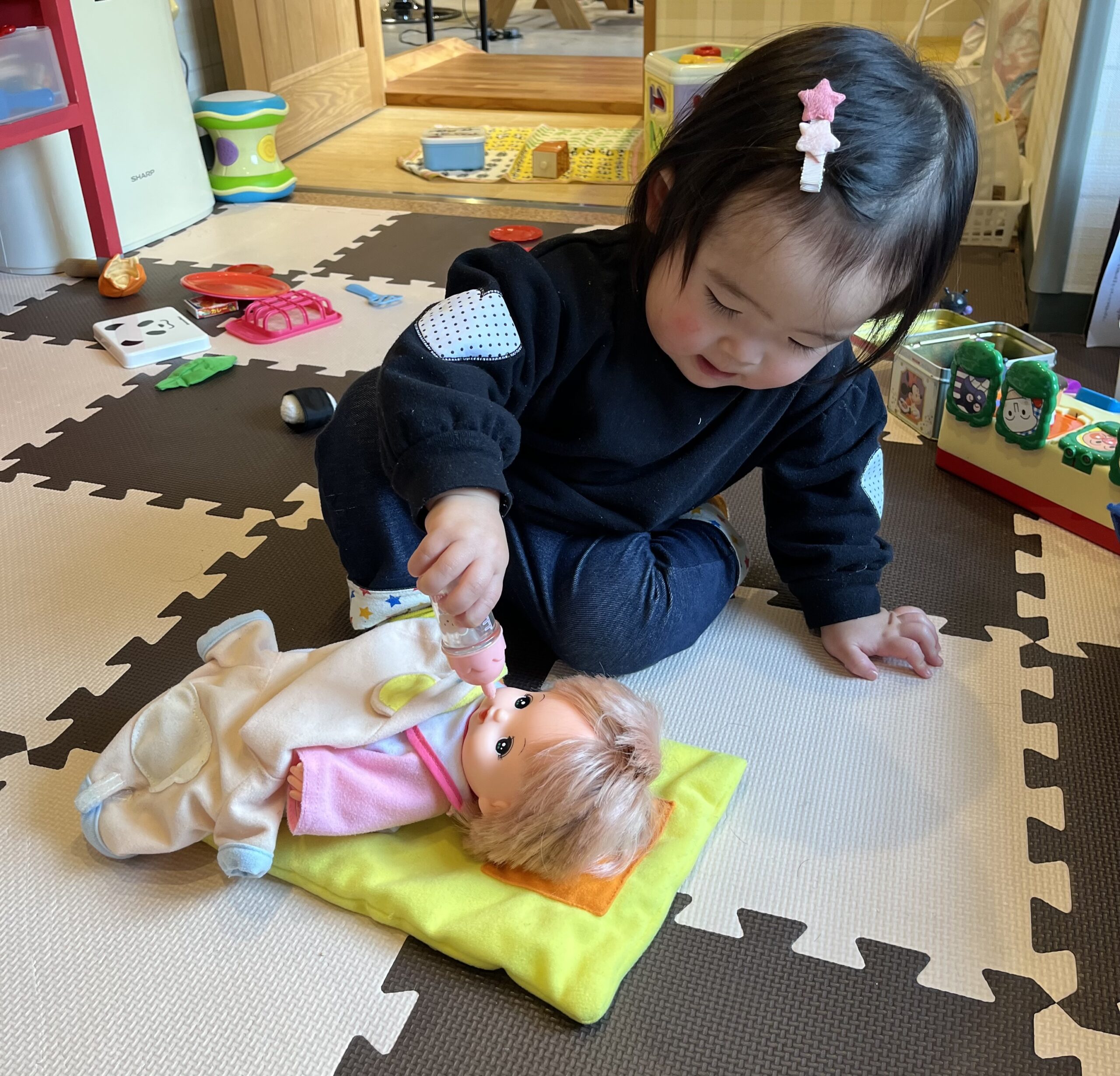 メルちゃんにミルクをのませてくれた後はお布団をかけて優しくトントンしている姿は小さなお母さんのようでした❣️