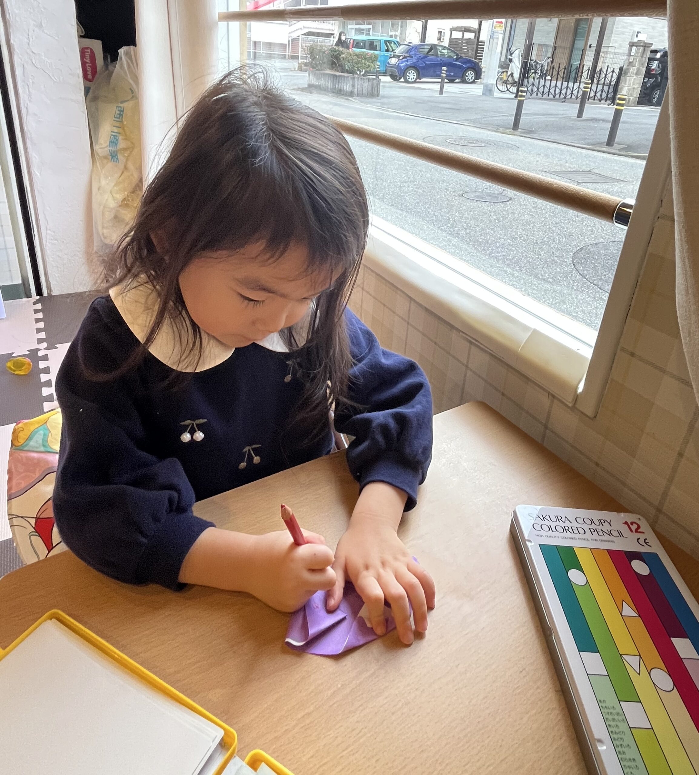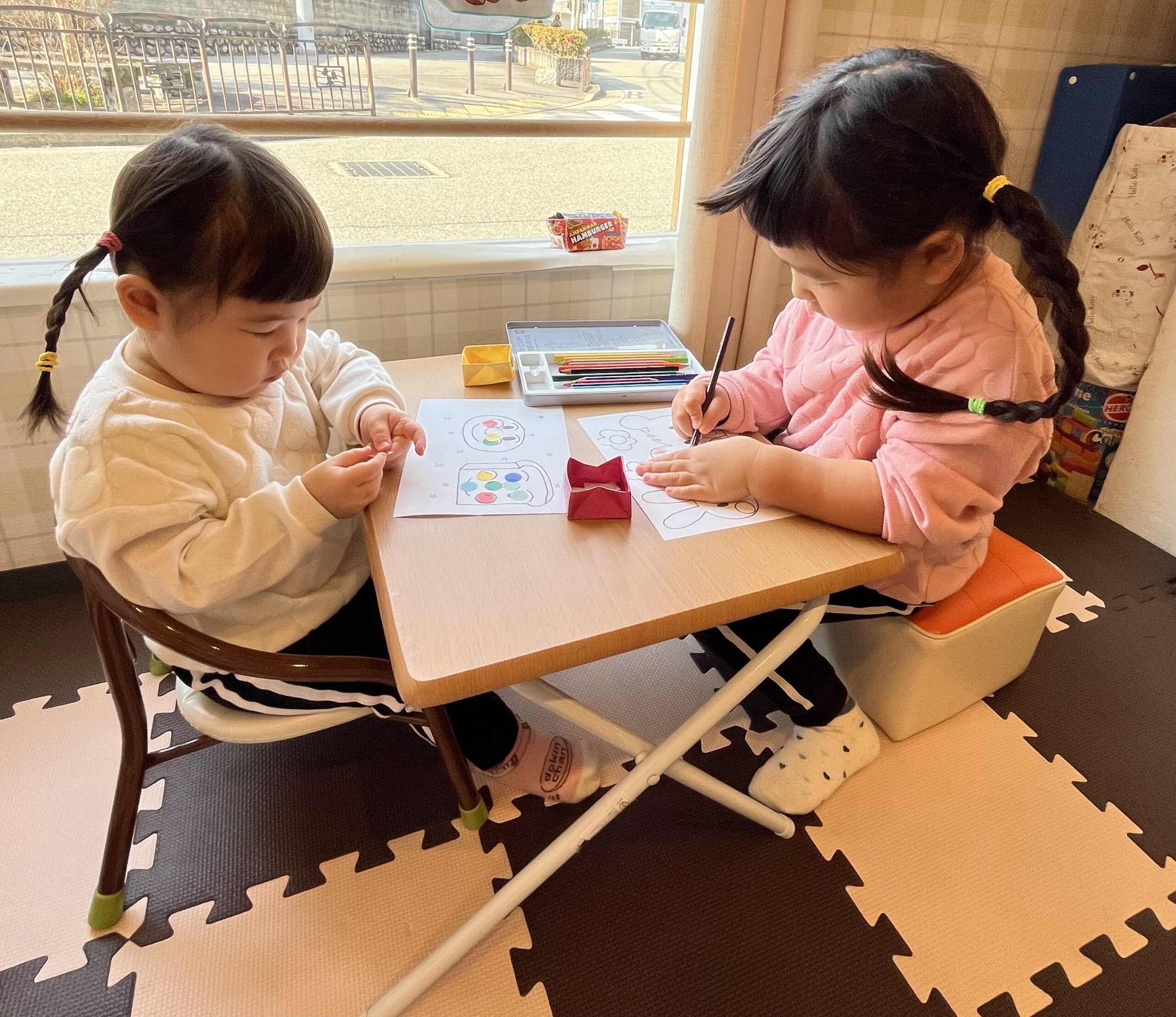 はみ出さないように丁寧に塗っていくお姉ちゃんと丸の中に丁寧にシールを貼っていく妹ちゃん。集中していました✨