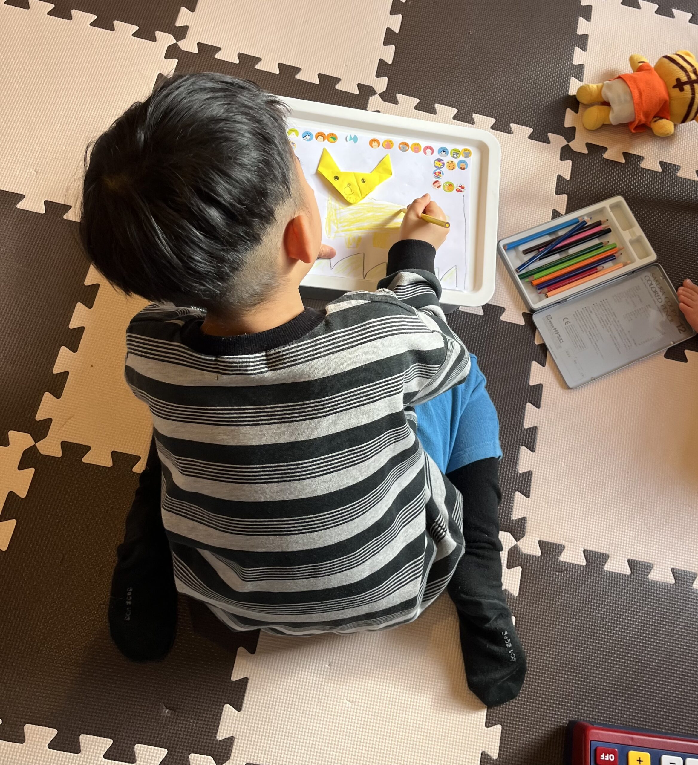 折り紙できつねを折って色鉛筆で草むらを描いて今回も素敵な作品を作ってくれました✨