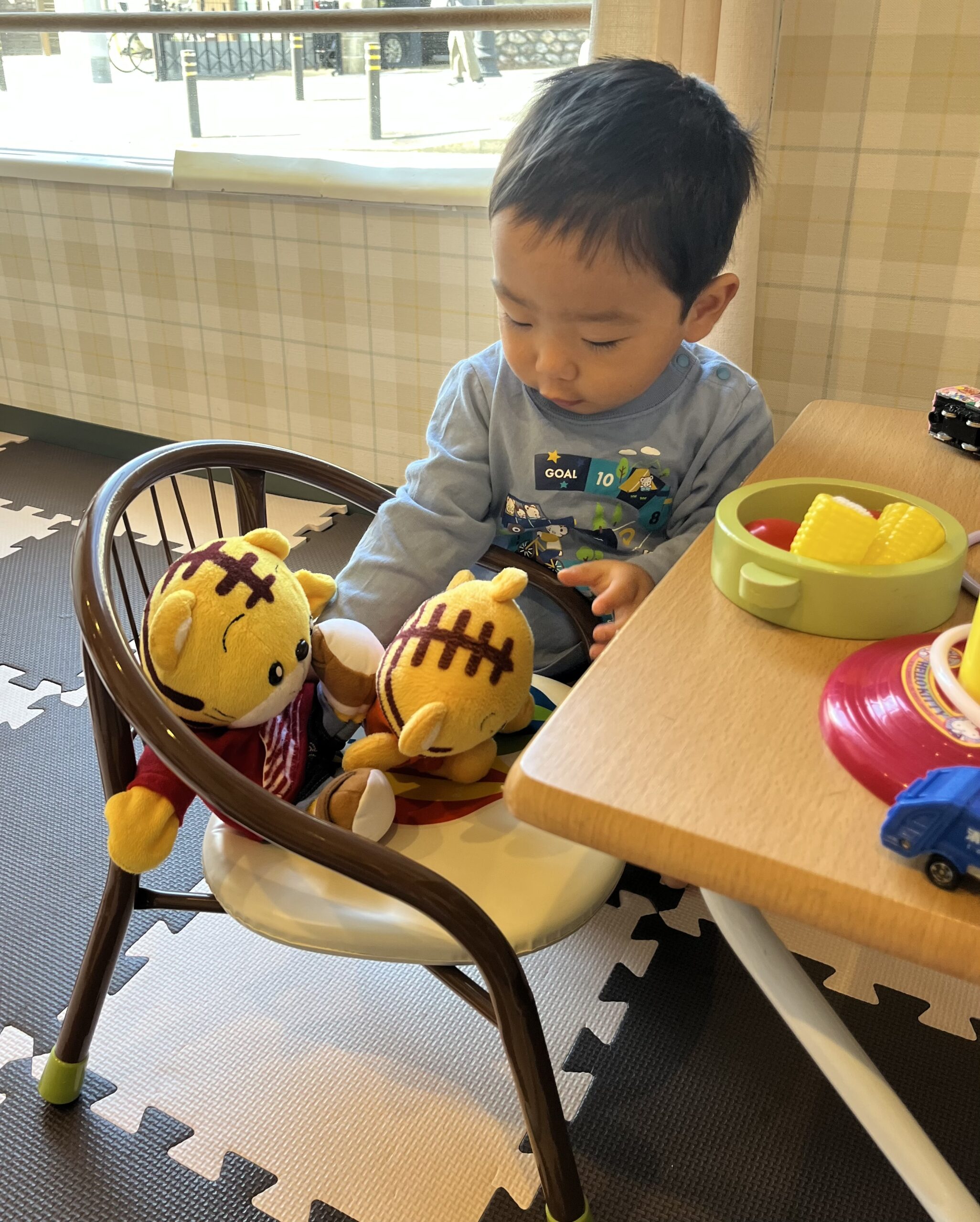 しまじろうたちのご飯の時間です🫕 『おっちんして!』と椅子に座らせてくれています☺️